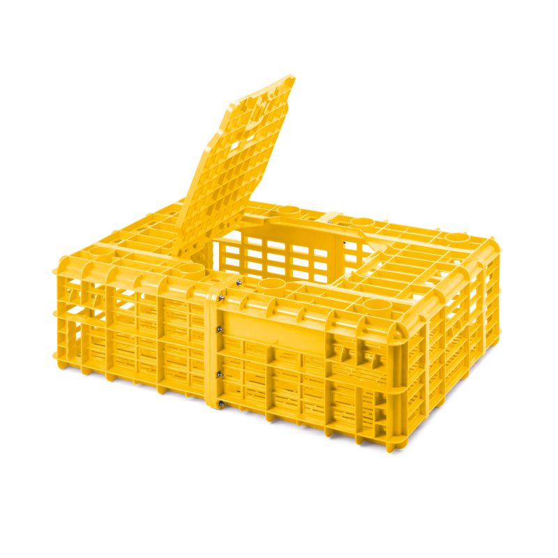 Caja plástica de gran durabilidad y rendimiento ideal para el transporte y distribución de pollos vivos. Fabricado con polietileno de alta densidad y protección UV. Con agujeros en las paredes para mejor ventilación y puerta con mecanismo de alta duración. Estructura resistente y resistencia. Apilables y de fácil agarre.