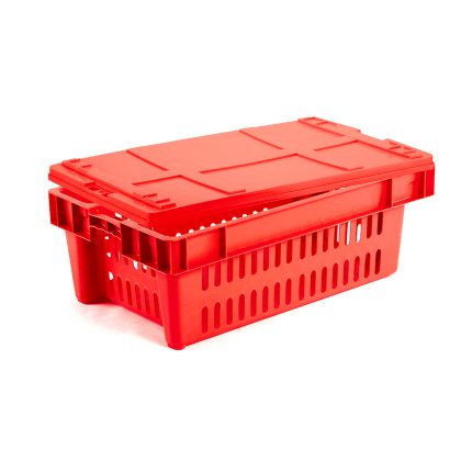 Caja plástica de gran durabilidad y rendimiento ideal para el transporte y almacenaje de productos avícolas. Fabricado con polietileno de alta densidad y protección UV. Con agujeros en las paredes para mejor ventilación y tapa para mayor protección.