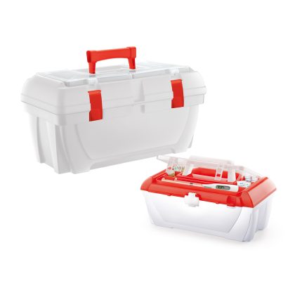 Caja organizadora para accesorios médicos, ligero y resistente para el fácil transporte. Con broche, compartimentos en la tapa, bandeja y asa plegable.