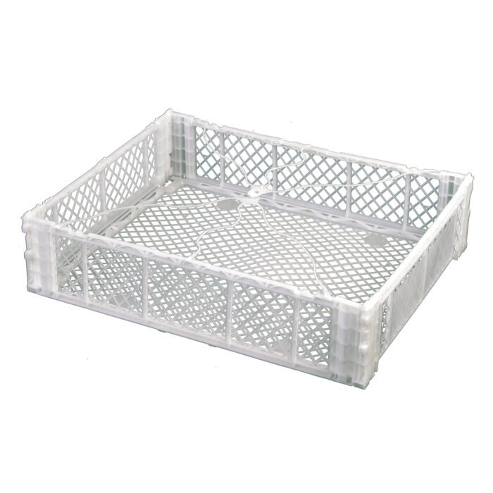 Caja plástica plegables para exportación de uvas, paltas, duraznos, nectarines, kiwis, ciruelas y frutos secos. Apilable con piso interior alisado. Columnas reforzadas con broches de fácil enganche y orificios para una mejor ventilación y drenaje.
