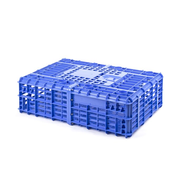Caja plástica de gran durabilidad y rendimiento ideal para el transporte y distribución de pollos vivos. Fabricado con polietileno de alta densidad y protección UV. Con agujeros en las paredes para mejor ventilación y puerta con mecanismo de alta duración. Estructura resistente y resistencia. Apilables y de fácil agarre.