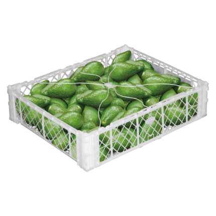 Caja plástica plegables para exportación de uvas, paltas, duraznos, nectarines, kiwis, ciruelas y frutos secos. Apilable con piso interior alisado. Columnas reforzadas con broches de fácil enganche y orificios para una mejor ventilación y drenaje.