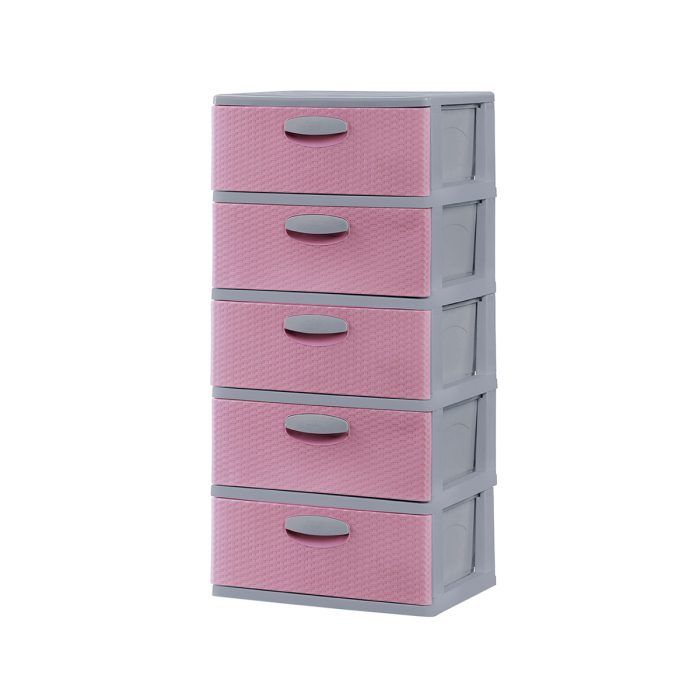 Cómoda de plástico súper espaciosa de 5 cajones con textura en simulación de mimbre. Armario de almacenamiento, cómoda para ropa, cajón de plástico, cómoda para dormitorio, hecho de plástico PP en alta calidad.