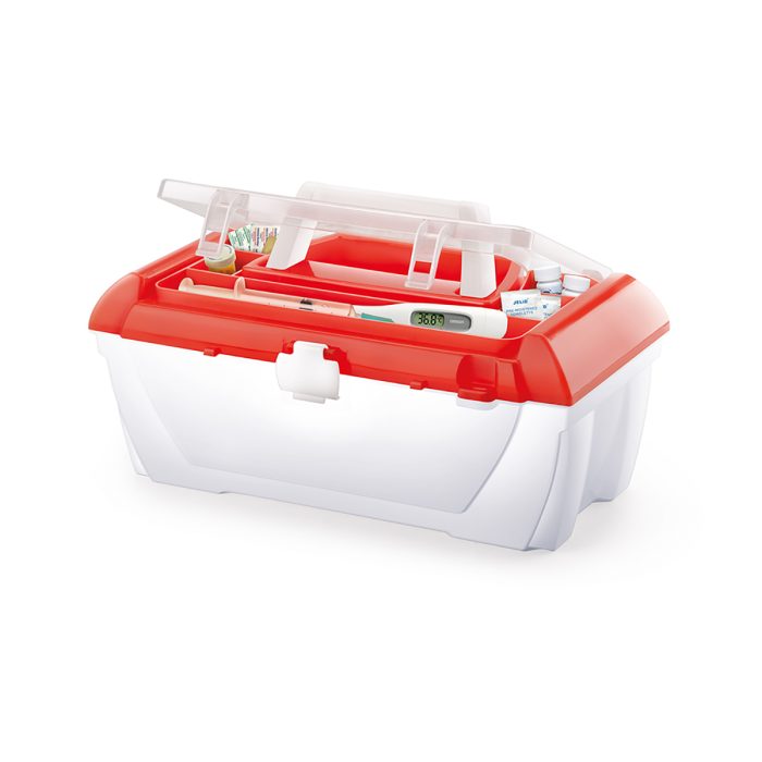 Caja organizadora para accesorios médicos, ligero y resistente para el fácil transporte. Con broche, compartimentos en la tapa y asa plegable.