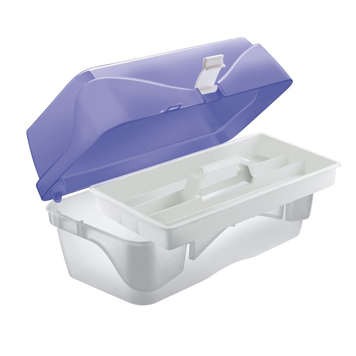 Caja organizadora para accesorios cosméticos, ligero y resistente para el fácil transporte. Con tapa alta, broche, bandeja y asa plegable.
