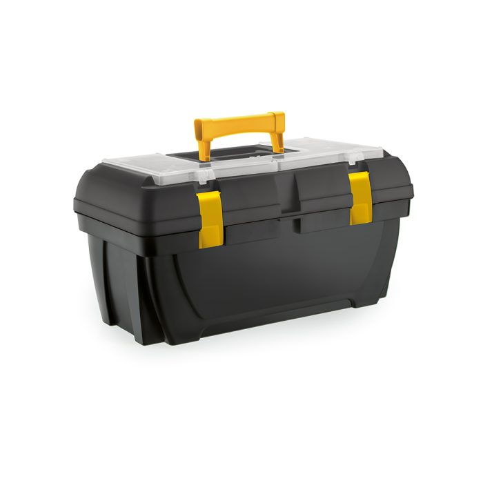 Caja organizadora de gran tamaño para herramientas, súper resistente para el fácil transporte. Con doble broche, compartimentos en la tapa, bandeja y asa plegable.