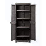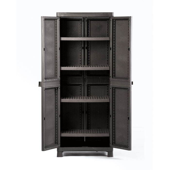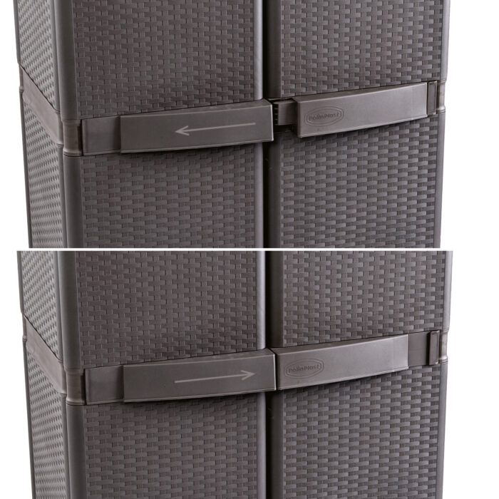 Eficiente y amplio armario de superficie textura mimbre, con resistentes niveles regulables para la organización y almacenaje de los objetos a guardar, con manija deslizable para un cerrado de puerta favorable.