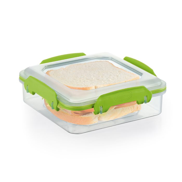 Precioso y moderno envase cuadrado de baja altura para llevar meriendas casuales. Libres de BPA o componentes contaminantes, súper herméticos gracias a sus ganchos de seguridad y su silicona en la tapa, en diferentes colores que van con tu estilo. Aguanta el frío o el calor justo para cada comida.