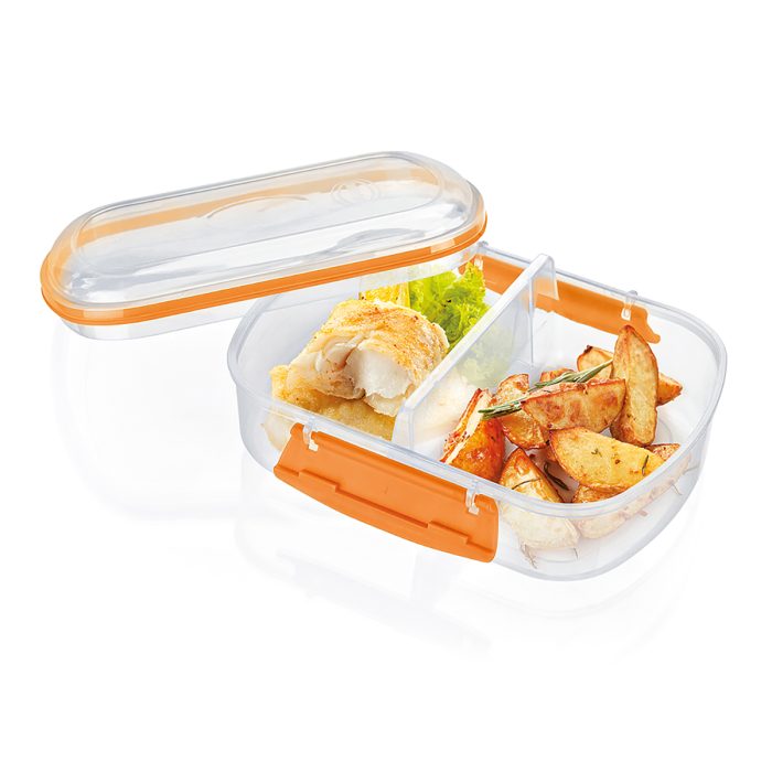 Funcional y moderno envase para llevar alimentos, con división interna integrada en el medio para separar las comidas. Libres de BPA o componentes contaminantes, hermético gracias a sus ganchos de seguridad y su silicona en la tapa. Aguanta el frío o el calor justo para cada comida.